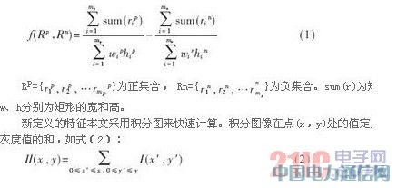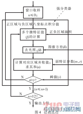 检测流程:(1)读入取样窗口和弱特征信息,求出每层的若干微特征值;(2)将微特征值除以窗口的灰度方差,得到归一特征值(f),实现归一化处理;(3)读入此微特征训练所得的参数(m,r),将归一特征值进行处理:h=(f-m)/r;(4)输出h,从查找表中取出对应的函数值b;(5)将强分类器所包含弱分类器对应的输入值相加:a=Σb;并将a与当前层的阈值y比较;判断通过与否。