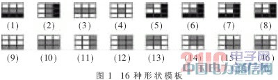 考虑到特征的表示能力和运算速度,文中只选择了其中16种表示能力强且易于快速运算的形状作为弱特征库,16种形状模板如图1所示。