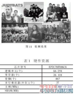 输入图像为256×256像素,其检测效果如图11所示。对此种输入图像采用缩放因子的s=1.3,平移因子的d=2.5,搜索从30×30像素到255×255像素范围内的人脸。整个系统用VHDL语言描述,表1为所用硬件资源情况。