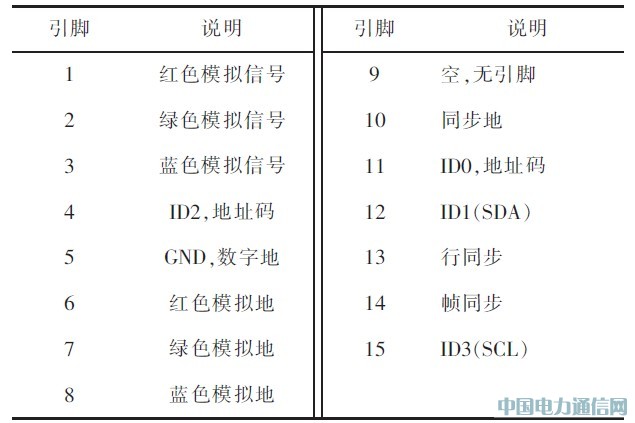 VGA(Video Graphics Arrnay)是IBM公司提出的目前仍然广泛应用于PC的显示接口。该接口具有分辨率高、显示速率快、颜色丰富等优点,在彩色显示器领域得到了广泛的应用。VGA接口在物理上表现为DB15的插座,其中VGA适配器端使用的是阴性DB15标准的接口。其引脚定义如表1所示。