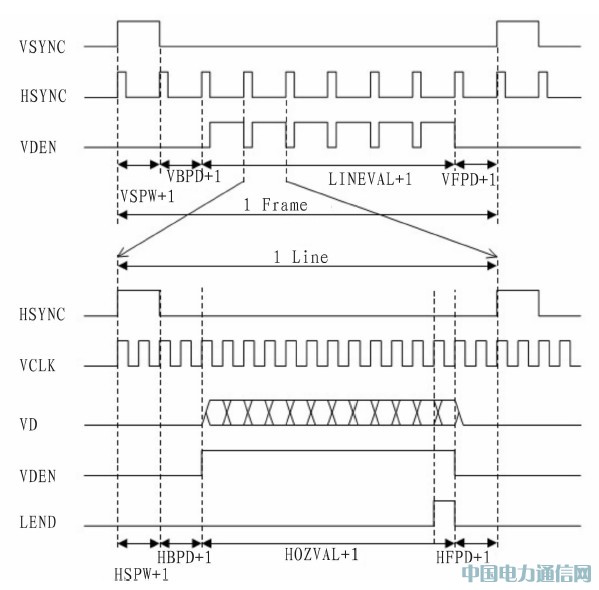 下面根据图4的VGA接口同步信号时序对主要的LCD控制器中的控制寄存器进行配置:
