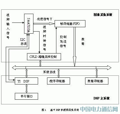 在研究基于DSP的视频监控系统时,考虑到高速实时处理及实用化两方面的具体要求,需要开发一种具有高速、高集成度等特点的视频图象信号采集系统,为此系统采用专用视频解码芯片和复杂可编程逻辑器件(CPLD)构成前端图象采集部分。设计上采用专用视频解码芯片,以CPLD器件作为控制单元和外围接口,以FIFO为缓存结构,能够有效地实现视频信号的采集与读取的高速并行,具有整体电路简单、可靠性高、集成度高、接口方便等优点,无需更改硬件电路,就可以应用于各种视频信号处理系统中。使得原来非常复杂的电路设计得到了极大的简化,并且使原来纯硬件的设计,变成软件和硬件的混合设计,使整个系统的设计增加柔韧性。
