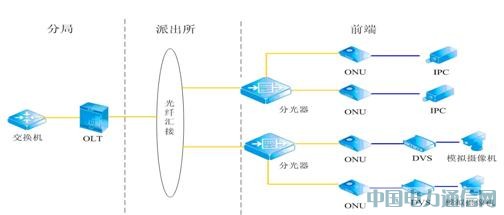 ▪ ONU置于前端部分,下接摄像机。已建监控点的模拟视频通过视频光端机(DVS)接入与ONU相连,新建网络摄像机直接与ONU通过五类线连接,接入数字视频专网。