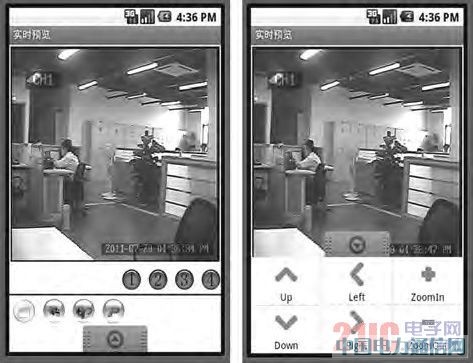 目前,该系统已经在实验室进行测试,服务器输出15fps CIF 格式的H. 264 视频数据,客户端安装在Android 手机上,通过WIFI 接入无线局域网中与服务器建立连接,用户界面如图4 所示,可实现远程视频预览、云台控制等操作。