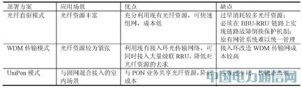C-RAN要实现低成本的光网络传输技术,因此BBU和RRU之间CPRI/Ir/OBRI接口的高速光模块的实现方案将成为影响这个系统经济性的重要环节。当前可行的部署方案有光纤直驱模式、WDM传输模式和基于UniPon的传输模式三种(见表1)。