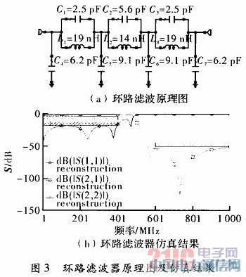 外部环路滤波可以将DAC输出的杂波和镜像频谱滤掉,可以平滑输出波形,对信号的输出质量有较好地改善作用。外部环路滤波器采用椭圆函数低通滤波器。电路设计时采用分立LC元件构成截止频率为400 MHz的低通滤器。电路原理及仿真结果如图3所示。