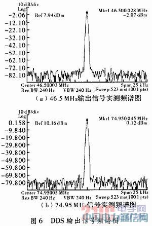 射频短波通信系统中对频率源的输出的频带宽度要求为46.5~75 MHz,步进频率为50 kHz。AD9912的输出分辨率为fDDS=f/248,本设计中采样时钟1 GHz,最小分辨率可达3.55μHz,完全可以达到设计指标。图6是安捷伦频谱分析仪实测的DDS输出信号频谱图。