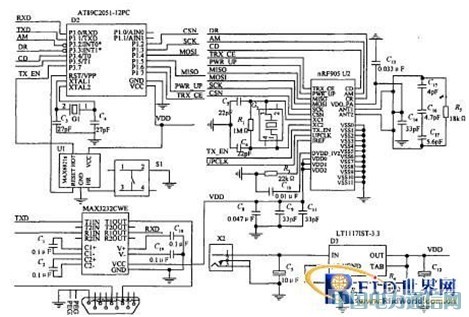 微控制器通过SPI接口控制nRF905,其中微控制器(MCU)采用Atmel公司生产的低电压、高性能COMS8位单片机 AT89C2051,该微控制器兼容标准MCS51指令系统,内含128B的随机存取数据存储器RAM和2kB的可反复擦写FLASH只读程序存储器,可以将驱动及控制nRF905的程序写入该闪存,无需外接EPROM而简化了电路设计降低了系统功耗。