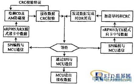 射频卡与阅读器的非接触数据交换构成一个无线数据通信系统,数据通过nRF905在阅读器和射频卡之间无线传输。