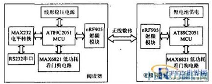图2 采用nRF905的主动式RFID系统硬件设计框图