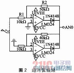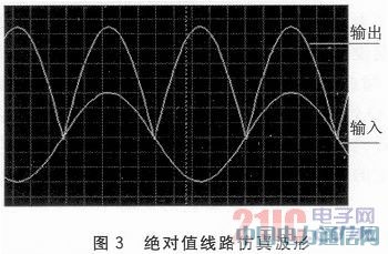绝对值线路的作用是将交流变成直流,线路简单、容易实现。绝对值线路和绝对值线路仿真波形如图2和图3所示。图2放大倍数是R2/R1=5,选用的两个运算放大器最好是同在一个芯片上,这样出来的半波才会对称。
