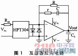 由于电力线路是高电压的交流电,而PIC18LF4620只能采样小于3.3V的直流电压,因此线路的电压都要经过变压器或互感器降压后再经过绝对值线路整流。本文选用电流型的精密微型电压互感器HPT304,互感器应用电路如图1所示。通过运算放大器输出,二次负载基本为0。被测的输入电压VIN通过限流电阻RIN限流,产生的0~2mA电流通过微型电压互感器。HPT304感应出相同的0~2mA。通过运算放大器可以调节反馈电阻R值在输出端得到所要求的电压输出,而电容C及电阻r是用来补偿相位差的。限流电阻RIN要有足够大的功率。