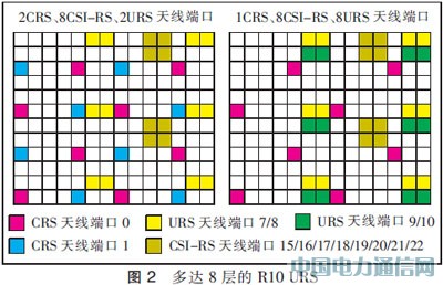 在图2中,给出了URS配置的2个实例。该规范支持使用12/24个资源元素(RE),它可用于URS,这取决于传输等级。例如,与R9中的情形一样,1层和2层可以采用12个资源元素和长度为2的叠加正交码(OCC)进行工作,而24个资源元素和长度为4的叠加正交码可用于3-8层。采用频分复用加上可变长度的OCC,支持根据传输等级,对RS开销进行有效扩展。我们注意到通过采用天线虚拟化(如降至某个CRS端口),CSI-RS为高效地降低CRS开销提供了机会,如图2的右半部分所示,而UE仍然能够通过CSI-RS接入多达8个天线端口。