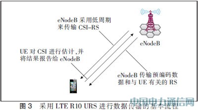 采用CSI-RS的系统操作基本原理如图3所示。终端基于CSI-RS来对CSI进行估计,并将CSI反馈传输给eNodeB,而eNodeB反过来可以在为数据选择预编码器和调制与编码方案(MCS)用CSI。数据可以和与用户有关(专用)的解调参考符号(URS,也称为DM-RS)一同传输,与数据一样,对同一物理资源块进行扩展。相同的传输预编码可用于数据层及相关的DM-RS端口。与LTE R8中的情形相反,它考虑了eNodeB使用任何预编码的情况,因为使用的预编码对于终端来说仍然是透明的,且不需要传输给用户。