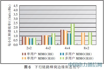 图5给出了下行链路平均频谱效率。假定eNodeB处使用的是均匀线性阵列,与采用2×2天线配置的R8相比,采用4×2天线配置的R10 MU-MIMO能够将容量提高40%。与R8相比,采用4×4天线配置的MU-MIMO能够将容量提高100%。使用4根发射天线的交叉极化阵列,增益数值略有减小。MU-MIMO对蜂窝边缘数据速率的好处甚至要高于对平均数据速率的好处,如图6所示:与采用2×2天线配置的R8相比,4×4天线配置能够将蜂窝边缘数据速率提高150%。但是,需要注意的是,蜂窝边缘吞吐量、峰值吞吐量和平均吞吐量数值可能会相互折衷,这取决于调度和多用户配对策略。已经证实,通过在第二空间层采用比例公平频域调度,选择保持公平性会导致覆盖性能显著提高。另一方面,选择针对第二个用户的频域调度的最大C/I类型将会提升峰值吞吐量,从而以牺牲覆盖范围为代价,提高了平均吞吐量增益。