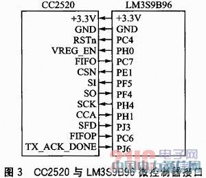 LM3S9B96微控制器提供了3个UART通信口,在zstack_collector工程中选择UART0作为串行通信端口。在系统时钟配置上,为使协调器节点运行在50 MHz的频率上,需使用PLL(Phase Locked Loop,锁相环)进行系统时钟4分频配置。另外,程序中使用定时器timer0A与time0B以支持协议栈任务的运行。CC2520与LM3S9B96之间采用SPI接口,其他引脚配置为:FIFOP作为接收数据包判断的重要引脚,对应开发板上的中断引脚PC6;数据缓存判断引脚FIFO则对应PC7。在接收模式下,当发生越界或帧接收完毕时,FIFOP引脚可以用来中断微处理器,FIFO引脚可以用来判断数据是否都处于接收FIFO中。CC2520与LM3S9B96微控制器的接口如图3所示。