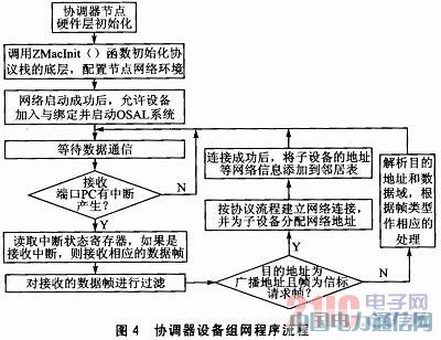 CC2520协调器软件初始化的基本思路是:先对LM3S9B96与CC2520控制端口进行初始化;使能触摸屏ADC通道,使能UART通信端口,使能SPI口,并通过SPI口按照CC2520芯片的操作时序初始化CC2520;操作系统抽象层加载协议栈运行任务,并提供信息管理、任务同步、时问管理、中断管理、任务管理、内存管理、电源管理以及非易失存储管理等服务。开启无线收发机后,就可以运行任务程序等待数据的收发。协调器设备的组网程序流程如图4所示。