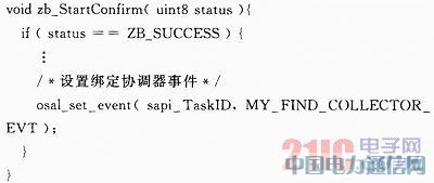 设备启动完毕后,作为路由器或终端节点的设备将自动调用回调函数zb_StartConfirm()确认设备是否启动成功,同时在函数内部触发设备绑定事件MY_FIND_COL_LECTOR_EVT。其核心代码如下: