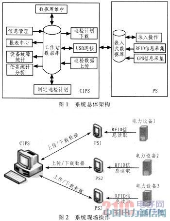 基于GPS和RFID技术的智能巡检系统主要由巡检终端PS和中央处理系统CIPS组成,总体架构如下:运行Windows Mobile嵌入式操作系统的PPC作为基础的巡检终端PS,该PS设置RFID扫描装置,用于定位设备(巡检对象),同时也被用作到位跟踪。后台管理系统提供设备管理、巡视管理和缺陷管理等功能。并接受来自于巡检终端的巡检资料。