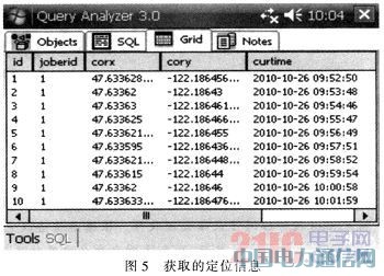 GPS信息采集用来记录巡检人员的路径信息,具有随PS同时启动功能,并自动运行于后台。利用开发的Microsoft.WindowsMobile.Sam ples.Location类库获取GPS定位信息,包括经度、纬度以及时间。该模块每隔一定时间向数据库中存储定位信息和时间,提供给管理员作为评价巡检人员工作状况的要素。终端向CIPS传输数据或者CIPS机向终端传输数据时,在后台运行的GPS会终止向数据库写入数据,这样可以保证数据在传输过程中不会产生冲突。保证数据传输的安全性。图5显示的是定位信息存储数据。