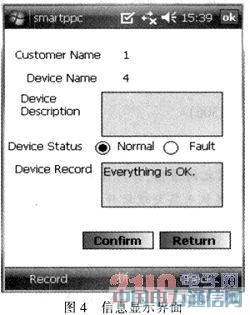 RFID信息的采集由阅读器(Reader)与电子标签(TAG)及应用软件系统3个部份组成,该巡检仪结合提供的RFID应用软件开发出适合Pocket PC的RFID信息采集软件,该软件包括终端信息显示界面和巡检数据录入界面。终端PS信息显示则是以表格的形式显示给用户,包括是否完成、序号、设备ID、设备名称、操作人信息等。由于每个巡检对象上都装有电子标签,通过Pocket PC安装的RFID阅读器,自动将信息扫面进终端数据库,并可激活信息采集软件,根据阅读到的具体ID信息进入相应的巡检数据录入界面。巡检数据录入则是记录数据的关键,主要有两部分组成,即Device Status记录巡检对象故障和正常、Device Record记录该设备的详细说明,如图4所示。