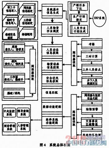 1)日常管理 包括考勤登记、矿井下工时计数、上井人员查点、矿井下人员定位跟踪等。矿业工作人员根据岗位不同分为井上、半井上、井下等几类。矿井下人员工作量确定既依据产矿量、掘进尺等工程数据,又与下井工时直接挂钩。半井上、井上人员都要求月井下工时数。引入RFID后,考勤、工时、查点实现自动化,确保高效率和准确性。矿井下人员定位、跟踪是事故顼防的基础,传统管理根本无法实现,而RFID技术填补了该管理空白。工作流程以地面管理系统数据库中生产作业计划人员、区域调度信息为基础,将射频标签ID、身份信息与巷道工作面信息等静态信息作为参考系,与巷道工作面阅读器获取的动态信息相对应,经系统中软件功能逻辑,实现各项功能。