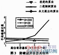 算法仿真:仿真结果如图3所示,可以看到当标签总数为20时,如果把高位寄存嚣的位数从4降到1,则平均碰撞次数从5.5回落到1.4。而当标签总数为200和2000时,高位寄存器位数的改变对平均碰撞次数的影响不大。因此如果在某次仲裁中出现多次空传,读写器可以在下一次仲裁时指示标签改变寄存器高位个数,以此降低空传率,进而可以降低平均碰撞次数。