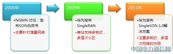 从2006年NGMN提出SON概念起,直到2010年,业界对SON的研究主要是针对LTE网络。华为从2006年起开始研发LTE SON,但到2009年发布SingleRAN后意识到由于运营商将长期同时运维多制式、多层次网络,只研究LTE SON对运营商降低OPEX的作用有限, SON必须向多制式、多层网络的方向发展并形成一个集中统一的解决方案,才能抑制运维成本-总收入的占比进一步上升。由此,华为SingleSON解决方案在2011年应运而生。SingleSON解决方案注重提高网络规划、部署、运维、排障过程的自动化程度,协调不同制式、不同层次网络间的关系,提升全网运维效率。