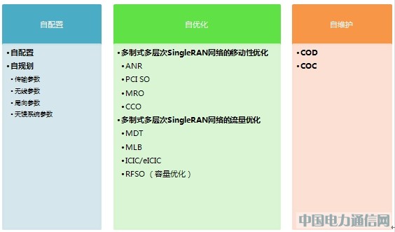 SingleSON主要包括下述3类特性,即自配置,自优化和自维护,如下图所示: