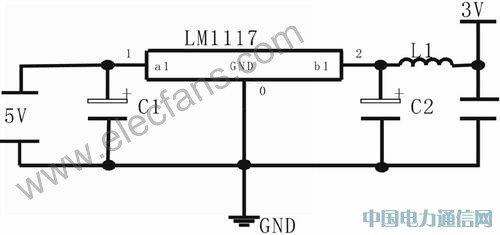 在网络节点中电源是能源中心,在节点中起着非常重要的作用,特别是在无线通信系统中,电源不光是能源供应者,它也直接影响通信的质量。器件对加到输入引脚或输出引脚的电压通常是有限制的。这些引脚由二极管或分离元件接到Vcc。如果接入的电压过高,电流将会通过二极管或分离元件流向电源。而现行的电压输出模块中多为5V电压,因而需要设计出一个输出稳定的5V转3V的电压调节模块。在该系统中,选用专为通信控制芯片提供转换电压的LM1117,它具有功耗低,体积小的优点。又因为电压中含有许多高频干扰源,这些高频成分很容易经过电源进入通信系统中。