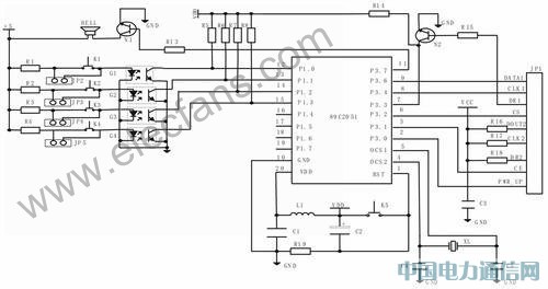 无线报警网络节点主要由微处理器AT89C2051、nRF2401无线通信芯片、外围设备和开关量输入接口的传感器构成。微处理器AT89C2051是整个网络节点硬件系统的核心控制部件,负责接收传感器触发的开关量报警信号,发送nRF2401通信命令,控制信息的传输。Nordic公司的单片射频收发芯片nRF2401是实现无线数据传输的关键器件。nRF2401工作于2.4~2.5GHzISM频段,芯片内置频率合成器、功率放大器、晶体振荡器和调制器等功能模块,输出功率和通信频道可通过程序配置,芯片功耗非常低,以-5dBm的功率发射时,工作电流只有10.5mA,接收时工作电流只有18mA,多种低功率工作模式,节能设计更方便。网络节点采用nRF2401进行数据传输,来实现报警信息的无线传输。网络节点通过连接的传感器感知外部环境异常变化。例如, 安装在门窗位置的红外接近开关可以用来监测盗窃者的非法入侵; 安装在天花板上的烟雾报警器可以监测到室内出现的突发火灾; 安装在地板上的水浸传感器, 可以感知到因水管爆裂、窗户进雨, 屋顶渗漏等因素引起的室内进水事件; 安装在厨房的煤气报警开关可以用来监测有无煤气泄漏。这些安全监测传感器, 均为开关量输入器件, 可以提供全方位的安全监测保障。网络节点的电路原理图如图2所示。