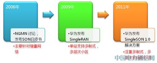 华为早在2009年就发布了LTE SON测试报告,SingleSON技术路标也十分明确。华为SingleSON的路标涵盖GSM、UMTS、LTE三个制式的SON特性规划,以及宏站和小站协同的SON特性规划。