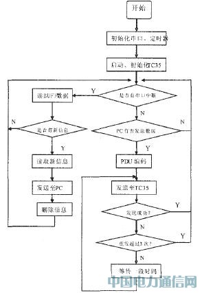 主程序是对整个系统框架的描述[3]。本系统主程序的功能是上电后,完成系统的初始化,然后等待PC端或TC35模块端的命令到达,并根据命令的内容完成相应的动作,如发送或接收短信。流程图如图3。