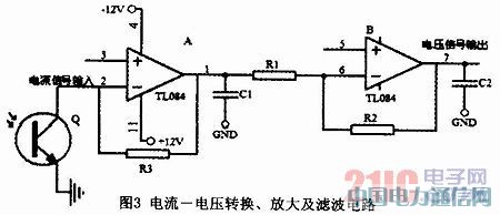 硬件部分最关键的是对硅光电池转换后的电流信号的处理。由于要进行模数转换就必须把电流信号转换成电压信号,因转换得到的信号很小且含有噪音信号,故我们要将其进行放大和滤波。在此用TL084集成放大器实现电流-电压转换及放大,利用RC电路进行滤波,其电路图如图3所示。转换后的电压信号直接输入AD转换电路的输入端,再将AD转换后的输出信号送入单片机进行处理及显示。其中AD转换采用的是12位转换器AD574。