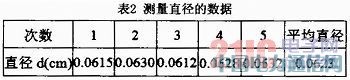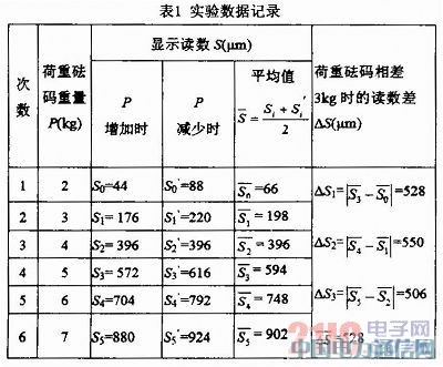 经过实验记录及数据处理,我们取位移值与经转换放大后的电压值的比例系数为44,在数据处理子程序中直接使用,用此系统去检测金属丝的伸长量,测得数据如表1所示。用千分尺测得钢丝的直径的数据如表2所示。