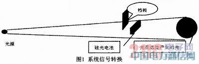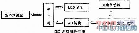 硬件部分主要有以下几个模块:由光源与硅光电池组成的光电转换模块;由TL084芯片及其外围元件组成的电流一电压转换及其放大、滤波模块;AD转换模块;最后是由单片机和LCD组成的数据处理及输出模块,如图2所示。下面简述一下前两个模块。