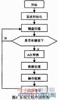为了方便程序调试和提高可靠性,程序设计采用自上而下、模块化、结构化的程序设计方法。本设计按任务模块划分的程序主要有初始化程序、主程序、A/D转换子程序、数据处理子程序(包括调零、判断操作是否错误、位移值及杨氏模量值)、LCD显示子程序、键盘扫描子程序。系统主程序流程图如图4所示,其中操作检测是帮助提醒操作者,若无误,LCD显示会显示功能按键相应的数据值,若操作有误,LCD显示会显示EOF字样。