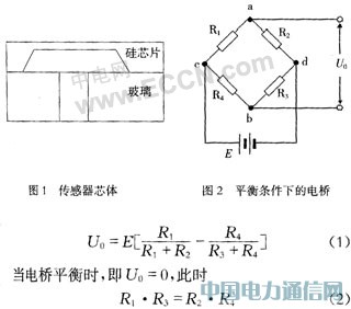 压阻式压力传感器芯体如图1,R1,R2,R3,R4是4片电阻片,当受外力作用时,电阻片R1,R3亦受拉伸作用电阻增大,R2,R4电阻减小,这样外力F的作用使4个电阻片电阻值发生变化。传感器上的电阻R1,R2,B3,R4接成图2所示的直流桥路。cd两端接稳压电源E,ab两端为电桥电压输出端,输出电压为U0,如图2。