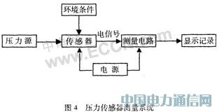 压力传感器测量系统主要同由压力源、被测试压力传感器、测量电路和显示记录四部分组成,它们的关系如图4所示。