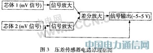 压差传感器的信号输出为模拟电压输出,电路的设计采用精密差动放大器线性放大压力敏感信号,将传感器零点输出值和满量程输出值调制到标称值。原理框图如图3。