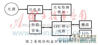 根据系统需要的功能,设计了结构的总体框架图,如图2所示。通过键盘按键发送控制信息,检测需要在温度恒定的情况下完成,所以需要一个恒温设备(热电制冷器和温度传感器DS18B20组成)提供稳定的检测环境,光源用的是红光LED灯,红光照射到盛装食用油的比色皿上,在光的透射方向上放一个光电检测模块(光频转换器TSL230B),把光电检测模块的数据传送到CPU(ARM芯片+FPGA芯片组成),经过数据处理后送到LCD显示。