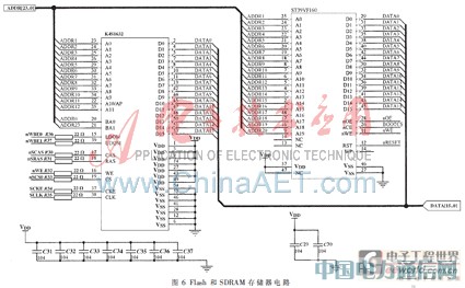 S3C44B0X的存储系统具有以下主要特性:ARM体系结构所支持的最大寻址空间为4 GB(232 B),ARM体系结构将存储器看作是从零地址开始的字节的线性组合,从零字节到第3字节放置第1个存储的字数据,从第4个字节到第7个字节放置第2个存储的字数据,依次排列;有8个存储体,访问大小均可进行改变(8 bit/16 bit/32 bit),每个存储体可达32 MB,总共可达256 MB,Bank0~Bank5可支持ROM、SRAM存储器,Bank6~Bank7可支持ROM、SRAM和FP/ED0/SDRAM存储器;有小端格式和大端格式两种方式存储字数据,可以通过外部引脚选择存储方式,在小端存储格式中,低地址中存放字数据的低字节,高地址存放字数据的高字节,大端格式低地址中存放字数据的高字节,高地址存放字数据的低字节[4],Flash和SDRAM存储器电路如图6所示。