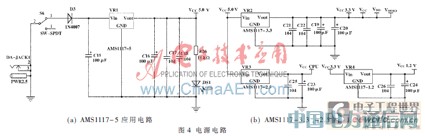 在本系统中,首先用电压转换芯片AMS1117-5把外部直流电源的9 V电压转换成5 V直流电压,电压转换电路如图4(a)所示,再用电压转换芯片AMS1117-3.3、AMS1117-2.5和AMS1117-1.2把5 V直流电压转换成3.3 V、2.5 V 和1.2 V直流电压,转换电路如图4(b)所示。