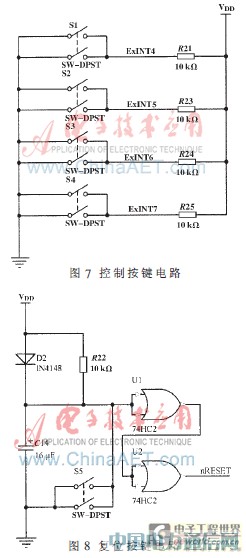 控制按键使用了4个按键(温度控制、量程控制、检测、显示),按键接口电路如图7所示。用到的4个接口分别对应S3C44B0X的中断接口ExINT4,ExINT5,ExINT6,ExINT7。从电路图上可以看到,中断接口通过上拉电阻被接到VDD,VDD是+3.3 V电压,始终保持着高电平。而当有按键被按下时,直接接地,置成低电平引发中断。复位电路如图8所示。