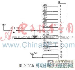 S3C44B0X内置LCD控制器具有很强的通用性,支持单色、灰度、彩色LCD屏, 通过编程可以支持不同的LCD显示器;通过处理器内部相关控制字就能分别设置屏幕尺寸、电平极性、接口时序、数据线宽度和刷新频率等参数;支持很多种不同规格和工作方式的STN (supertwisted nematic)液晶显示器;还支持4位双扫、4位单扫、8位单扫3种扫描方式的显示方式[4]。图9所示是LCD显示器的外接接口电路,通过数据线可以与LCD显示器连接使用。