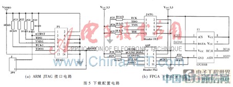EP2C5T144C8支持JTAG接口和主动串行ASP接口下载配置,在具体设计中,可先用JTAG方式调试程序,当程序调试无误后,再使用主动串行ASP方式把程序固化到配置芯片。如图5(b)所示,JTAG为下载插座;E1为配置芯片EPCSISI8;ASP为主动串行ASP下载插座,供固化程序到配置芯片使用。