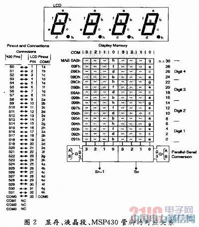 MSP430F413带有液晶驱动电路和显示缓存,通过对显存中各位的置位和复位来使得液晶屏上对应的段显示或消失,将斜率转换后得到的数据发送到显存,就可以在液晶屏上显示出测得的温度。MSP430有4种驱动方式,选用哪种驱动方式由需要驱动的液晶段数以及液晶屏的管脚和液晶屏内部电极的排布决定。本系统采用的液晶屏是大连东显电子有限公司生产的EDS812液晶显示屏。该显示屏可以显示3位数字,有24个管脚,其中1个公共极管脚,23个段极管脚。由于该液晶屏只有1个公共极,只能采用静态驱动方式。根据图2和表1所示的对应关系连接MSP4 30和EDS812,并将数据写入显存,即可显示出测得的温度。