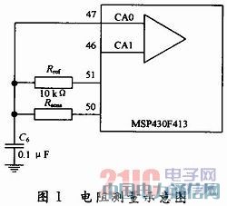 应用MSP430的比较器(Comparator_A)和定时器(Timer_A),可以测量热敏电阻的阻值。根据阻值和温度的对应关系可以得出待测的温度,实现A/D转换。将Comparator_A的CA0端接外部信号,CA1端接内部参考电压0.25Vcc。Timer_A工作在捕获模式,下降沿捕获,通过CCI1B捕获CAOUT。先使P1.2端口输出高电平,通过Rref给电容C6充电。充电完毕时,CA0端电压高于CA1端电压,CAOUT输出1。读Timer_A的计数值t0,t0=TAR。然后再使P1.2端口输出低电平,电容C6通过Rref放电,当CA0端电压降至0.25Vcc时,Comparator_A输出翻转,CAOUT输出0,Timer_A通过CCI1B捕获到下降沿,触发定时器中断,读出捕获值CCR1,t1=CCR1。C6通过Rref放电到0.25Vcc的时间time_ref=t1-t0。再对热敏电阻Rsens充电和放电,同样测出C6通过Rsens放电到0.25Vcc的时间time_sens。由下面的公式可以计算出热敏电阻(Rsens)的阻值。