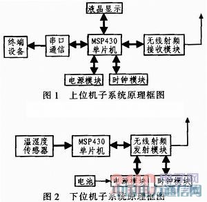 本次设计的无线温湿度监控系统有上位机子系统和下位机子系统两个部分组成。上位机子系统由主控芯片MSP430单片机、无线射频接收模块、天线、液晶显示模块、电源模块、时钟模块、串口通信模块、终端设备等组成。上位机子系统原理框图如图1所示;下位机子系统由主控芯片MSP430单片机、温湿度传感器、无线射频发射模块、天线、电源模块以及时钟模块等组成。下位机子系统原理框图如图2所示。