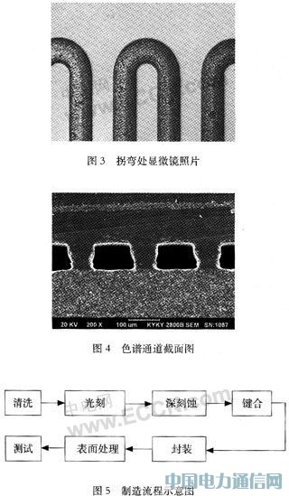色谱柱采用深反应离子刻蚀技术加工在8 cm的硅片上,硅片厚度500 μm,色谱柱通道全长6 m,深100μm,宽100μm,横截面为矩形。硅片正面采用深刻蚀技术加工色谱柱通道,通道形状如图1所示。图2是深刻蚀后硅片的照片。拐弯处的显微镜照片见图3。深刻蚀完成后,硅片与Pyrex 7740玻璃进行键合,形成密封的色谱柱。密封好的色谱通道截面的电子显微镜照片见图4。气体从进口处进入,经过6 m长的S型弯曲色谱柱,最终从出口流出。全部制造流程示意图见图5。